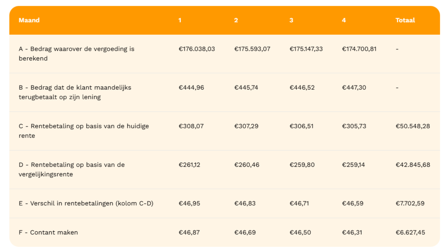 Het verschil tussen de rentebetalingen op basis van de huidige rente en de rentebetalingen op basis van de vergelijkingsrente is het renteverschil. Het renteverschil berekenen wij voor alle maanden van de overgebleven rentevastperiode van de klant.