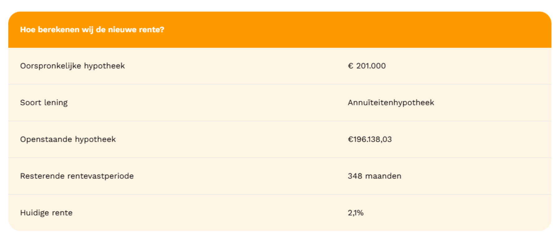 - De vergelijkingsrente: de rente die van toepassing is op de dag dat wij het verzoek van Dylan ontvangen. Voor het vaststellen van de vergelijkingsrente gaan we uit van een soortgelijke hypotheek en risicoklasse.